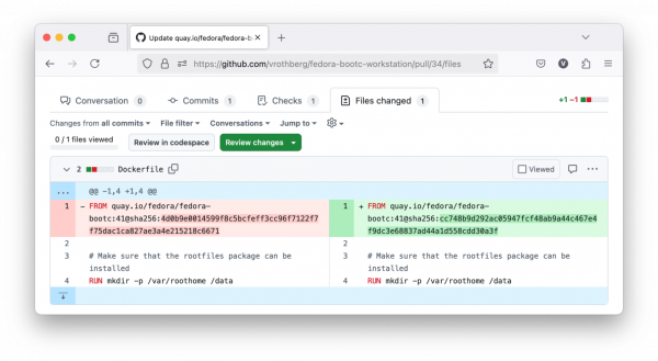 The main idea is to be aware, intentional, and control the images we consume and the image changes. In an article about CI/CD pipelines for Image Mode for RHEL, we elaborated on the benefits of referencing an image by digest to achieve a GitOps-like workflow to build and manage bootc images in a fully automated fashion. Dependency-management bots will automatically open a pull request to update the digest in our Containerfile, so we have full control of the changes. We are making use of this setup to manage a bootc-based workstation here. Figure 2 illustrates automated digest updates to a Dockerfile.
