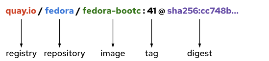 A reference can contain a domain (quay.io) pointing to the container registry, one or more repositories (also referred to as namespaces) on the registry (fedora), and an image (fedora-bootc) followed by a tag (41) and/or digest (sha256). Note that images can be referenced by tag, digest, or both at the same time, as shown in Figure 1.