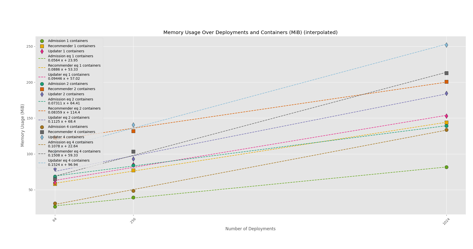 In this phase, I started with 64 deployments (with 1 pod and 1 container), and 64 VPA CRs in the first step. After sleeping for 5 minutes and obtaining benchmarking data, I scaled to 256 deployments with the same ratio of pods and containers. Then I scaled to 1024 deployments and 1024 VPAs and gathered our data.