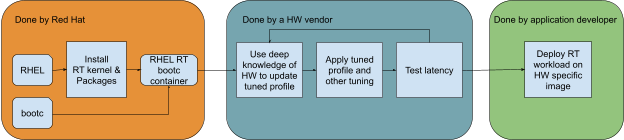 Figure 2 depicts a possible workflow where hardware vendors take over responsibility for the hardware-specific tuning required for real-time applications by adding layers with tuning to a bootable container. That workflow should greatly simplify deploying a real-time application using a pre-tuned RT bootable container for an application developer. In the most extreme case, it is as easy as the following:
