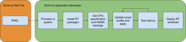 Currently, tuning steps require deep understanding of the underlying hardware (HW) platform as well as the impact configuration parameters have on latency. Figure 1 depicts a typical, simplified workflow for RT applications on a Red Hat Enterprise Linux (RHEL) example. This reflects the complexity of steps that must taken before starting testing an RT workload.