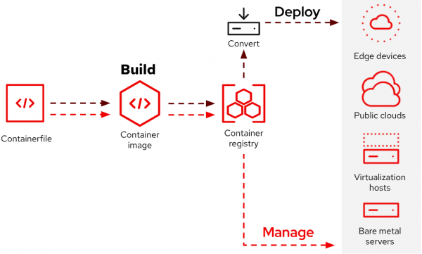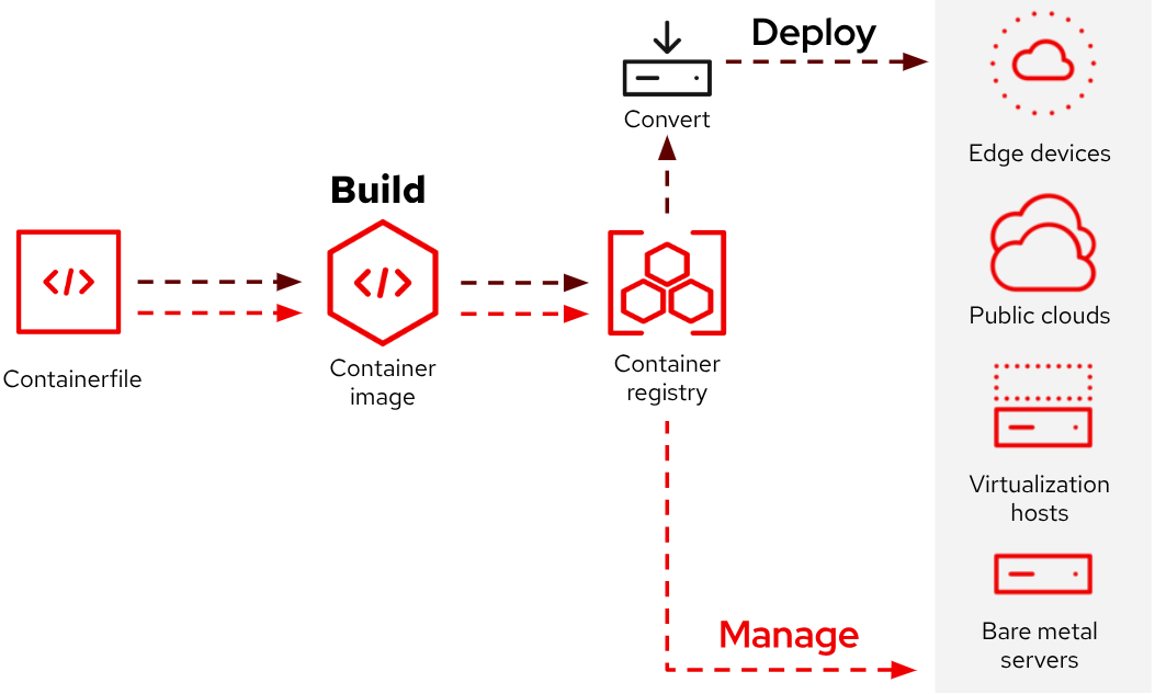 Image mode for RHEL fits perfectly into your existing container workflow. It offers the ability to consolidate deployment processes by using the same tools to deploy RHEL that are used to deploy container images for applications. Figure 2 depicts an overview of the workflow.