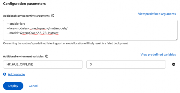 --model=Qwen/Qwen2.5-7B-InstructSet HF_HUB_OFFLINE to 0 as shown in Figure 3. This allows downloading the base model from Hugging Face Hub.