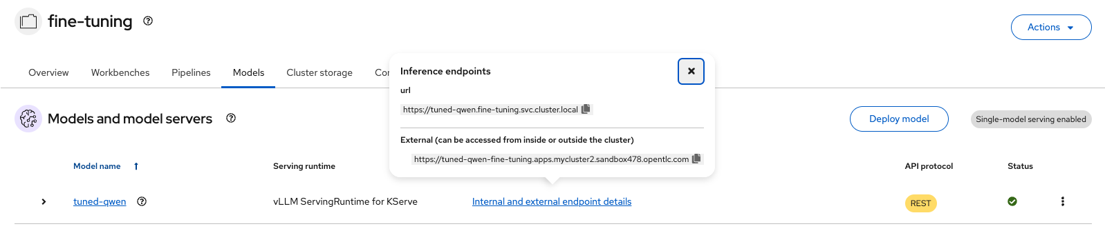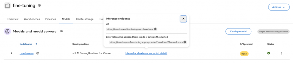 The trained model is stored in model-volume as a LoRA adapter, which can be served with the base model on OpenShift AI.