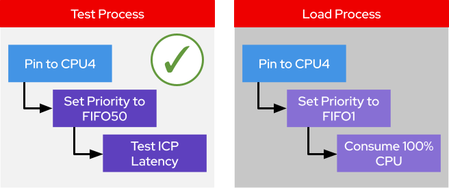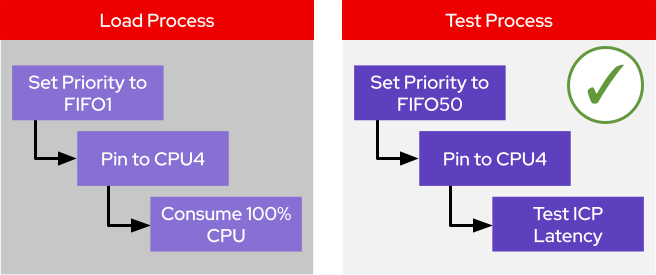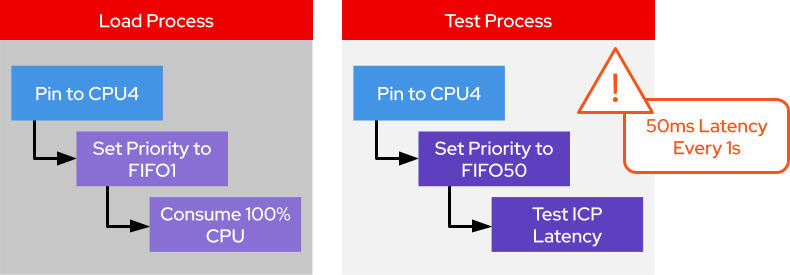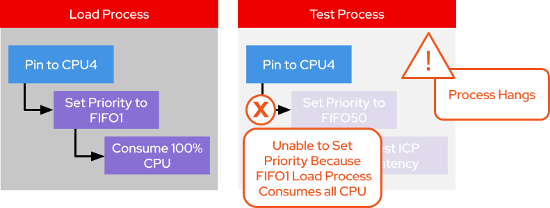 However, when the test process starts, it is first pinned to the same CPU as the load process while still prioritized as CF NICE0. Since that CPU is fully consumed by the load process, and there is no throttling to relieve it, the action to re-prioritize the test process to FIFO50 cannot be taken. Thus, the test process simply hangs indefinitely.