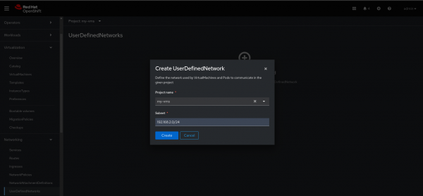 Once you create the namespace, you can proceed to create the UDN. With OpenShift 4.18, you can easily create UDNs via the web console by navigating to Networking -> User Defined Networks. In my example, I have created a namespace scoped UDN using a 192.168.2.0/24 subnet for the “my-vms” namespace. This means pods/VMs that connect to this UDN will have an IP allocated from this UDN network (Figure 1).