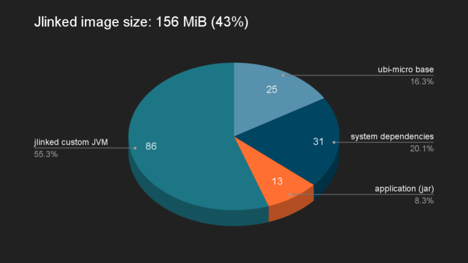 In our 2021 article, we described how to configure OpenShift to perform a two-stage build, cherry-picking the application and layering it on top of the OpenJDK runtime images. The images produced by this method are smaller than plain S2I, but we felt we could make them even smaller. The OpenJDK runtime is about half the total image size, so it was our focus to find savings.