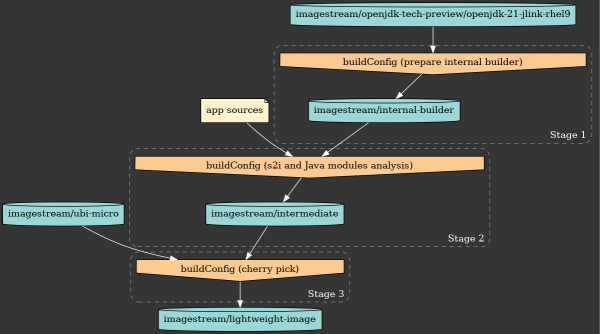 By extending S2I, we can analyze the Java application to determine which OpenJDK modules it requires, and produce a minimized OpenJDK runtime, tailored to that application. Building upon the two-stage build, we extract both the application and the bespoke runtime and layer them on top of a runtime image. Figure 1 shows the OpenShift jlink three-stage build pipeline.
