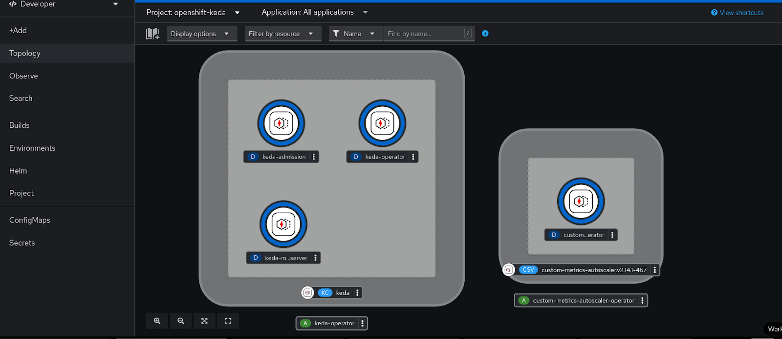 keda-operator-69b768cfb4-tzvzw 1/1 Running 0 10dFigure 1 shows a Keda pod view in the OpenShift console in developer view.