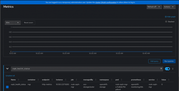 Figure 2 shows the ceph health status in OpenShift Metrics Console.