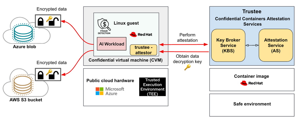 In this demo, we showed you the steps to run a fraud detection AI model in the Microsoft Azure public cloud, using confidential virtual machines on RHEL and remote attestation with a Trustee.