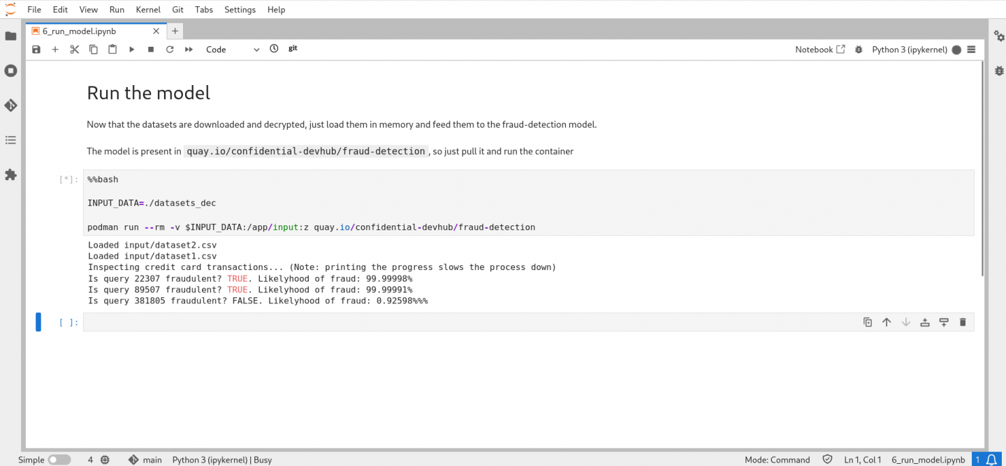 To simplify the workflow, we will provide a container with the fraud detection model ready to fetch all the data files stored in a specific folder, and output which transaction is considered fraudulent. The following code is also available in the notebook image.