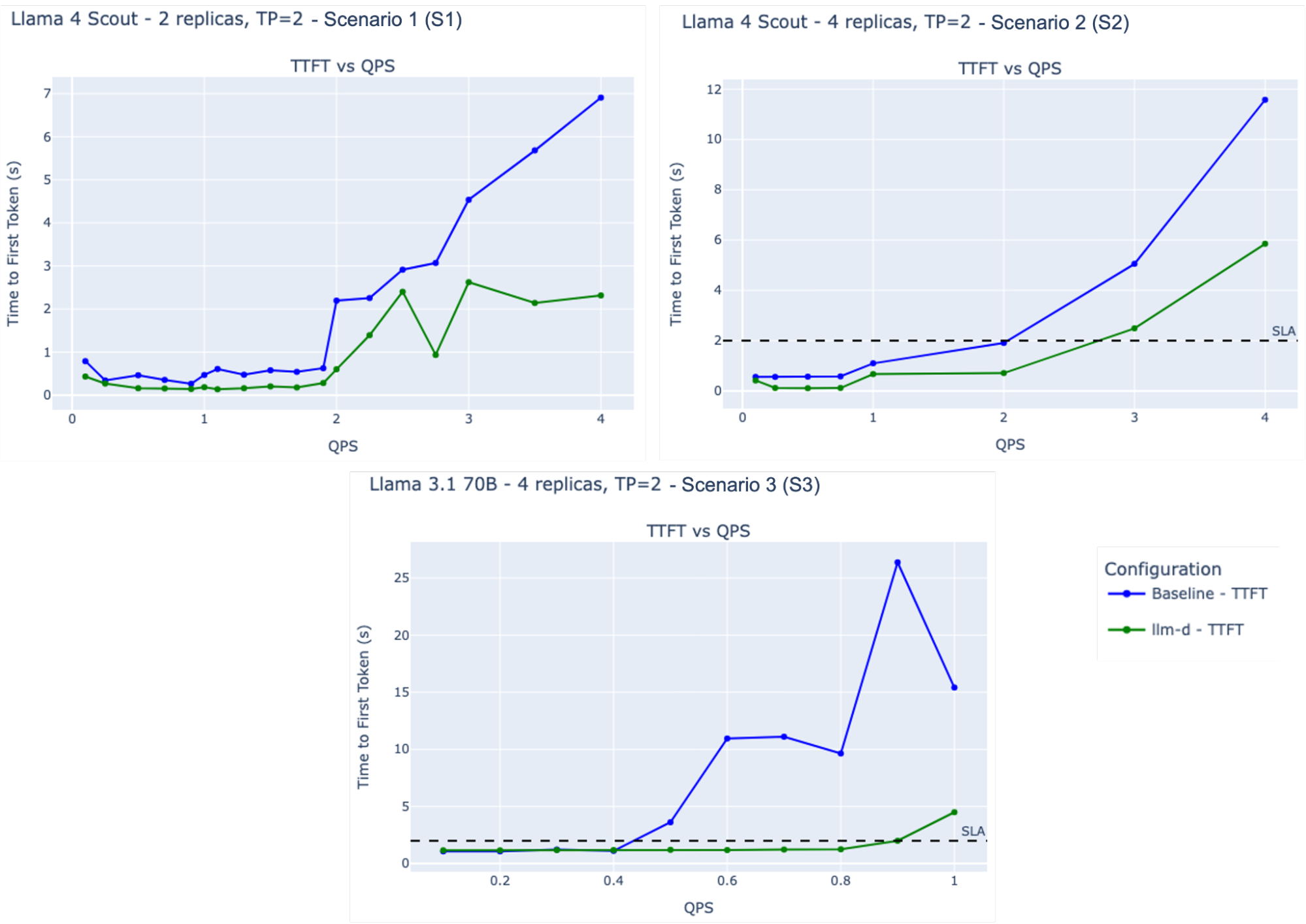 - S1: At 4 QPS, llm-d achieves a mean TTFT approximately 3X lower than the baseline (lower is better).