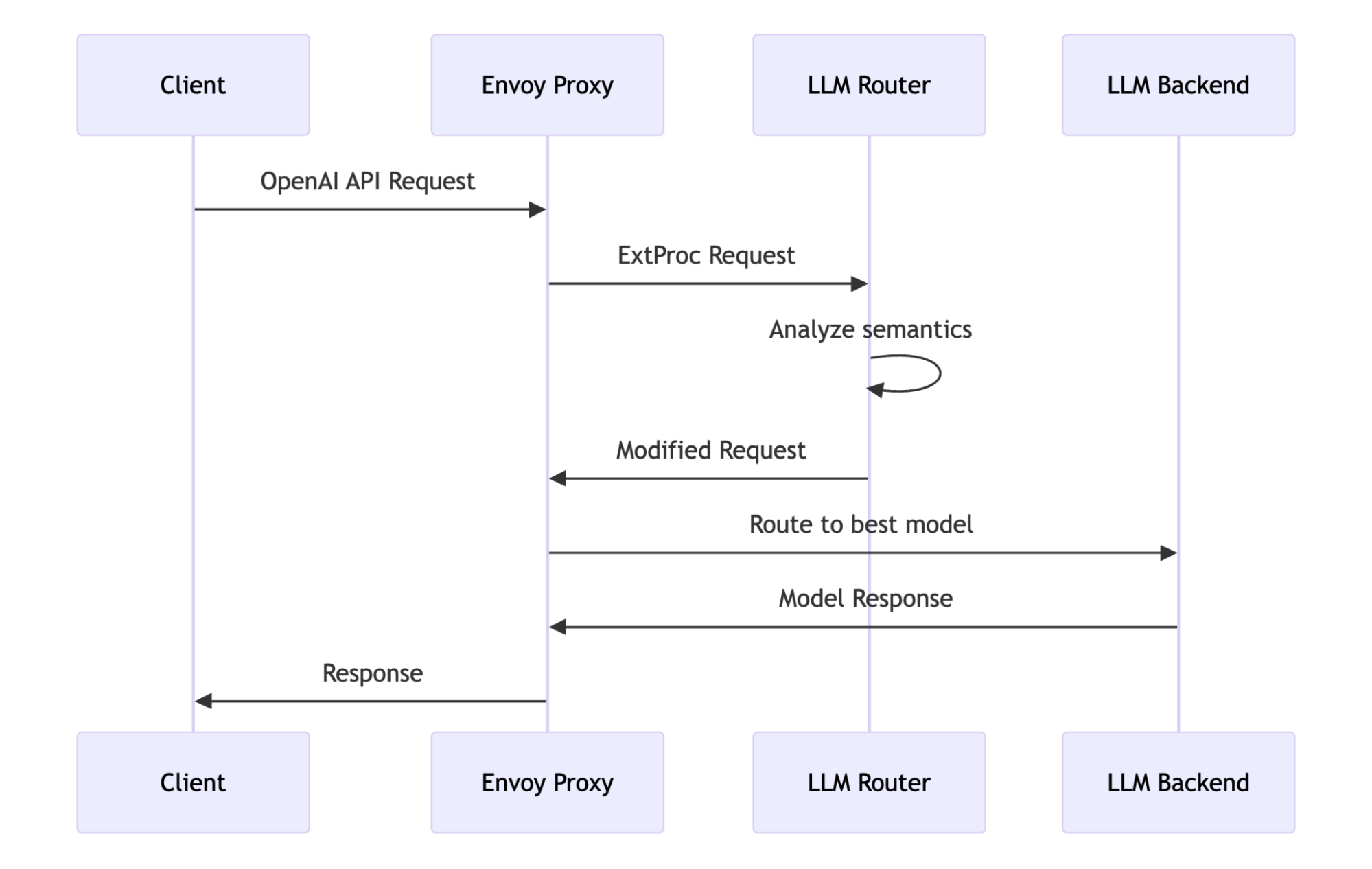 - Envoy forwards the request to the ExtProc filter (Semantic Processing LLM Router).