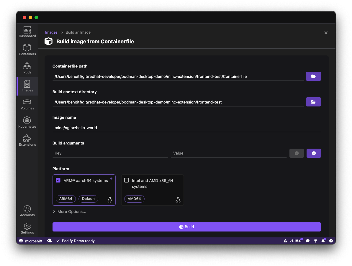 Figure 1: Building an image from a Containerfile in Podman Desktop. # Using the CLI: podman build -f Containerfile -t minc/nginx:hello-worldVerify image availability in MicroShift: Once the image is built, it's immediately accessible within the MicroShift container's image store. You can verify this by executing the following command inside the MicroShift container (via a tool like