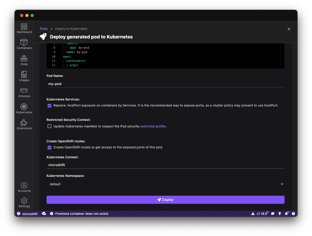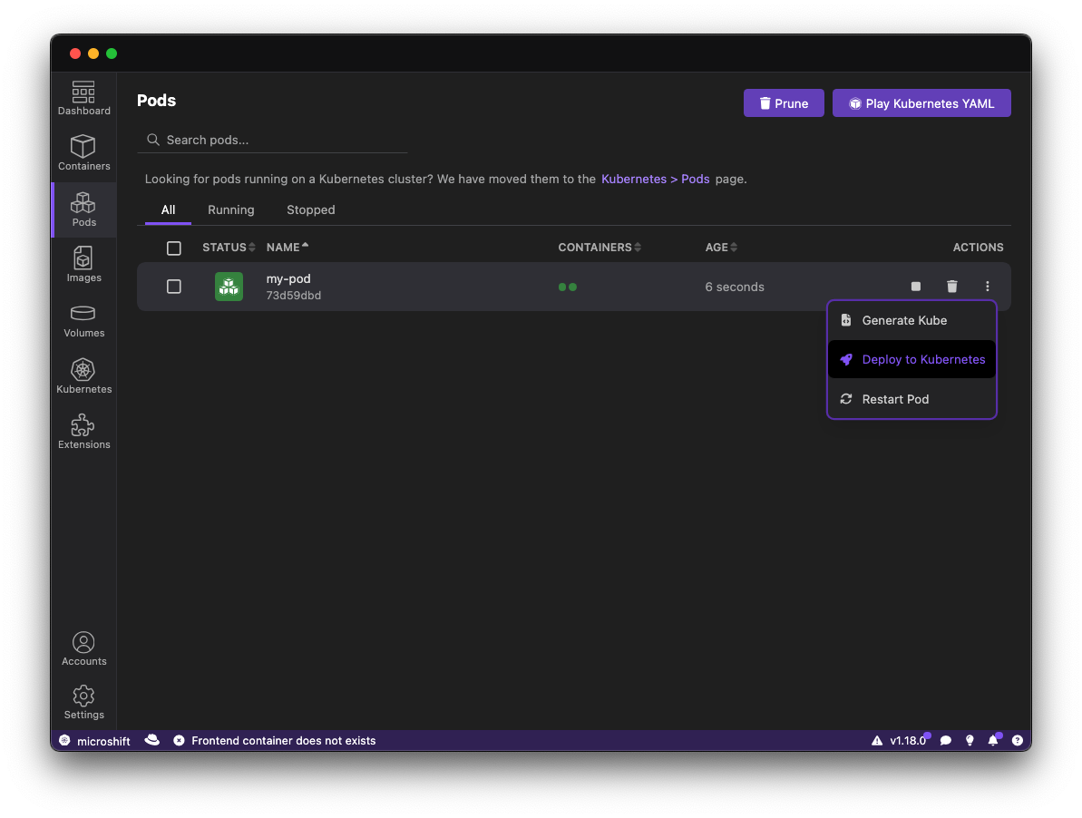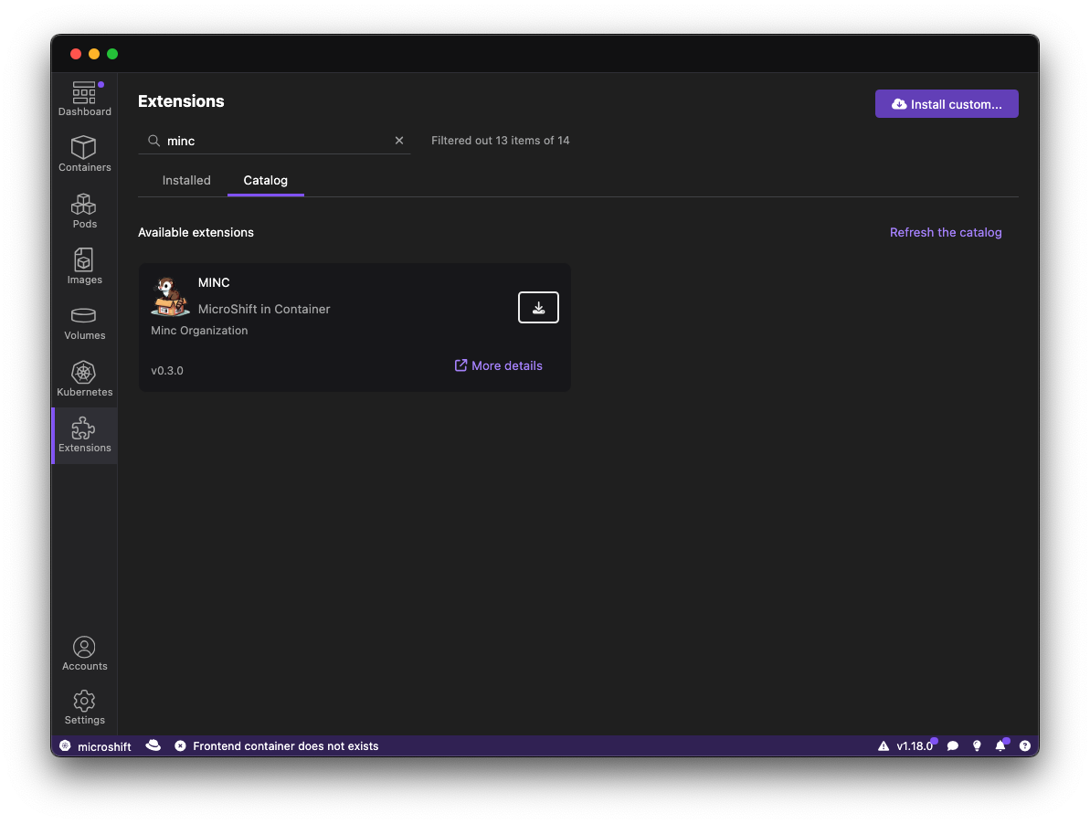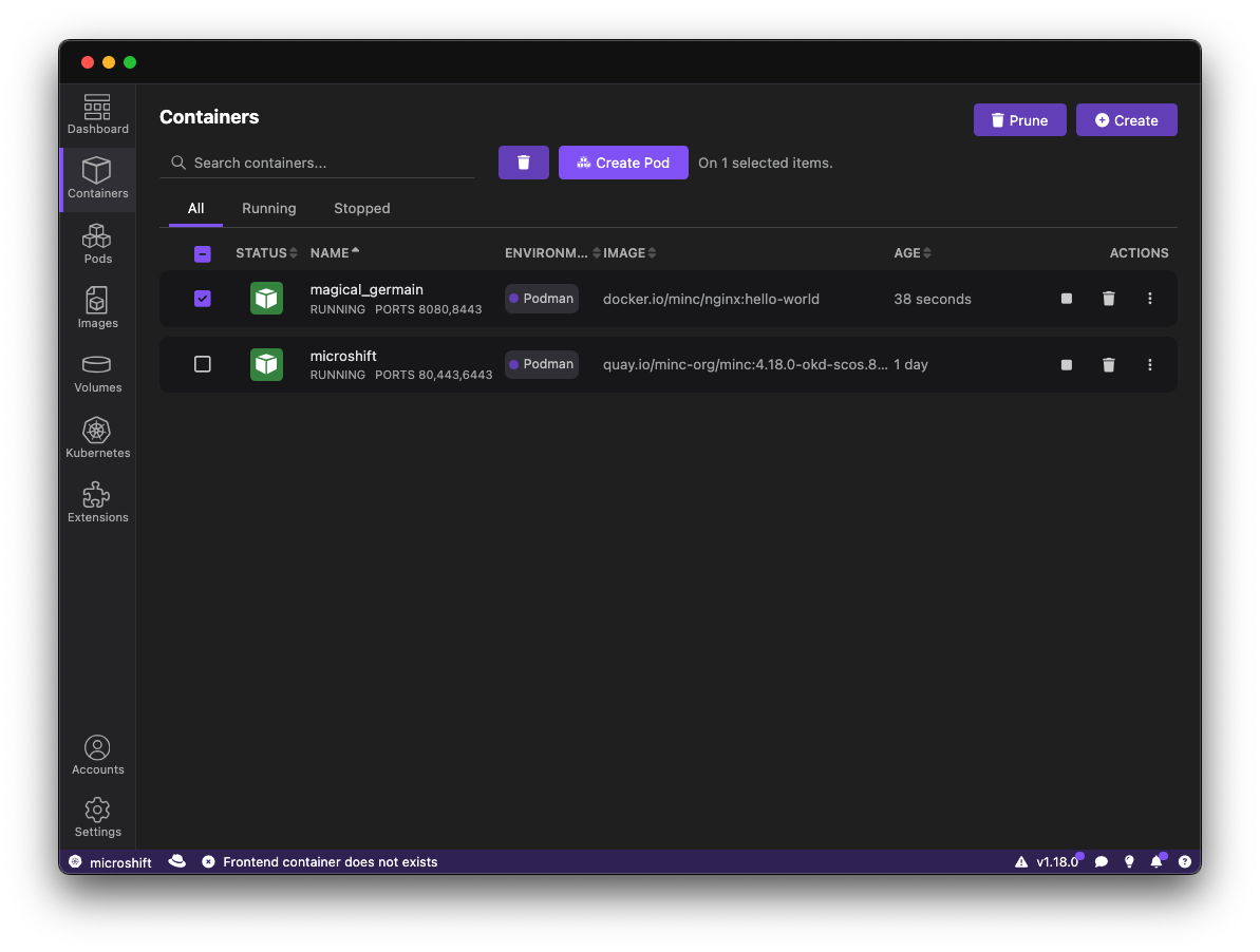 - MINC will automatically configure your kubectl context, making it ready to interact with your new MicroShift cluster. You can verify the active context in the Podman Desktop status bar.
