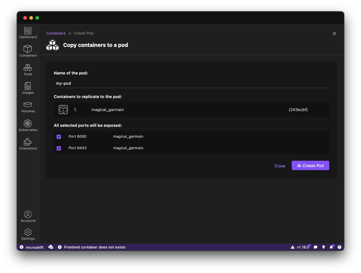 minc/nginx:hello-worldimage listed, as shown in Figure 2.Deploy to Kubernetes: Now you can start a container from this image and then create a pod from Podman Desktop by selecting the container and clicking Create Pod (Figures 3 and 4). Open the Pod and click Deploy to Kubernetes (Figure 5). This deploys the pod to the MicroShift container (Figure 6).