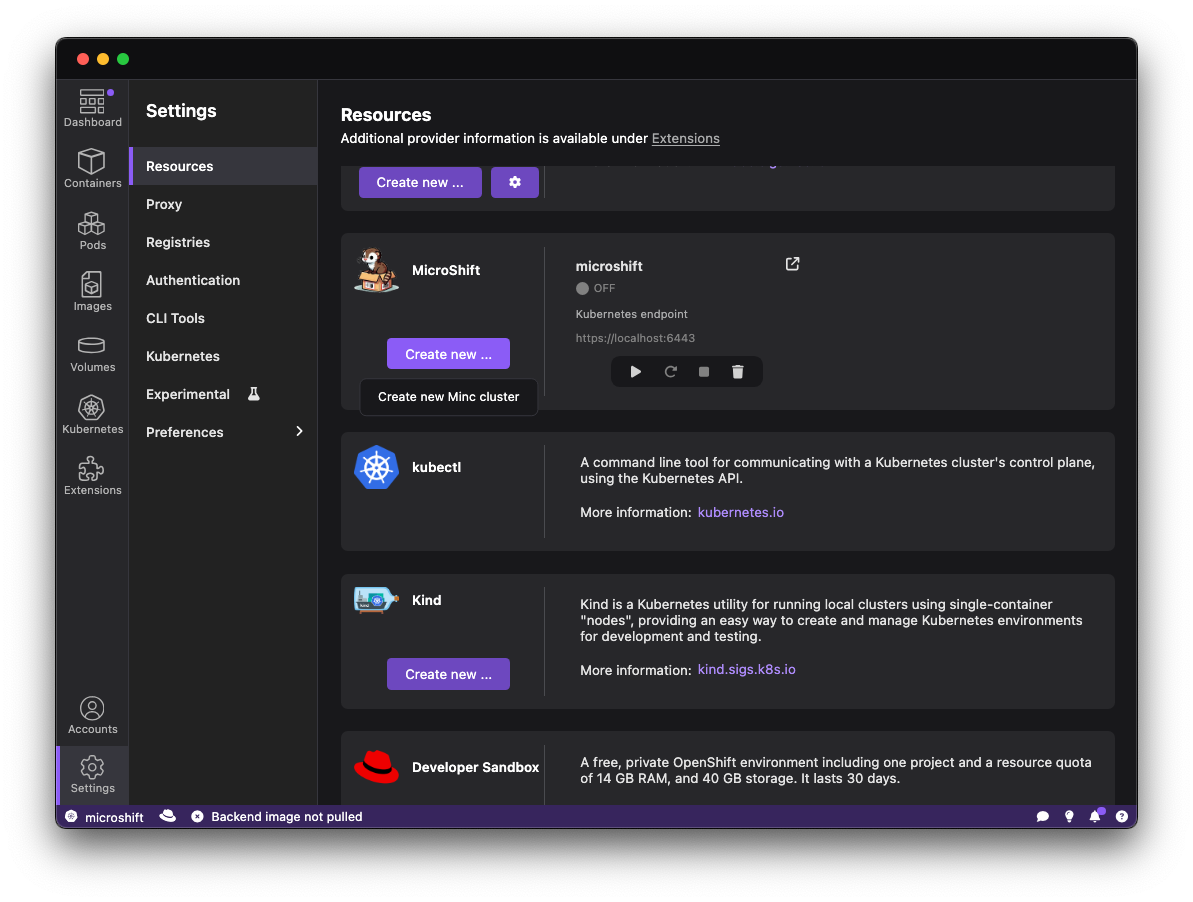 - Once installed, you'll find a MINC card in the Resources view. Click on it and select Create new... to initiate the creation of your local MicroShift cluster (Figure 8). Note that MINC requires a rootful Podman machine. You might need to create a new machine with the rootful option if your current one is rootless.