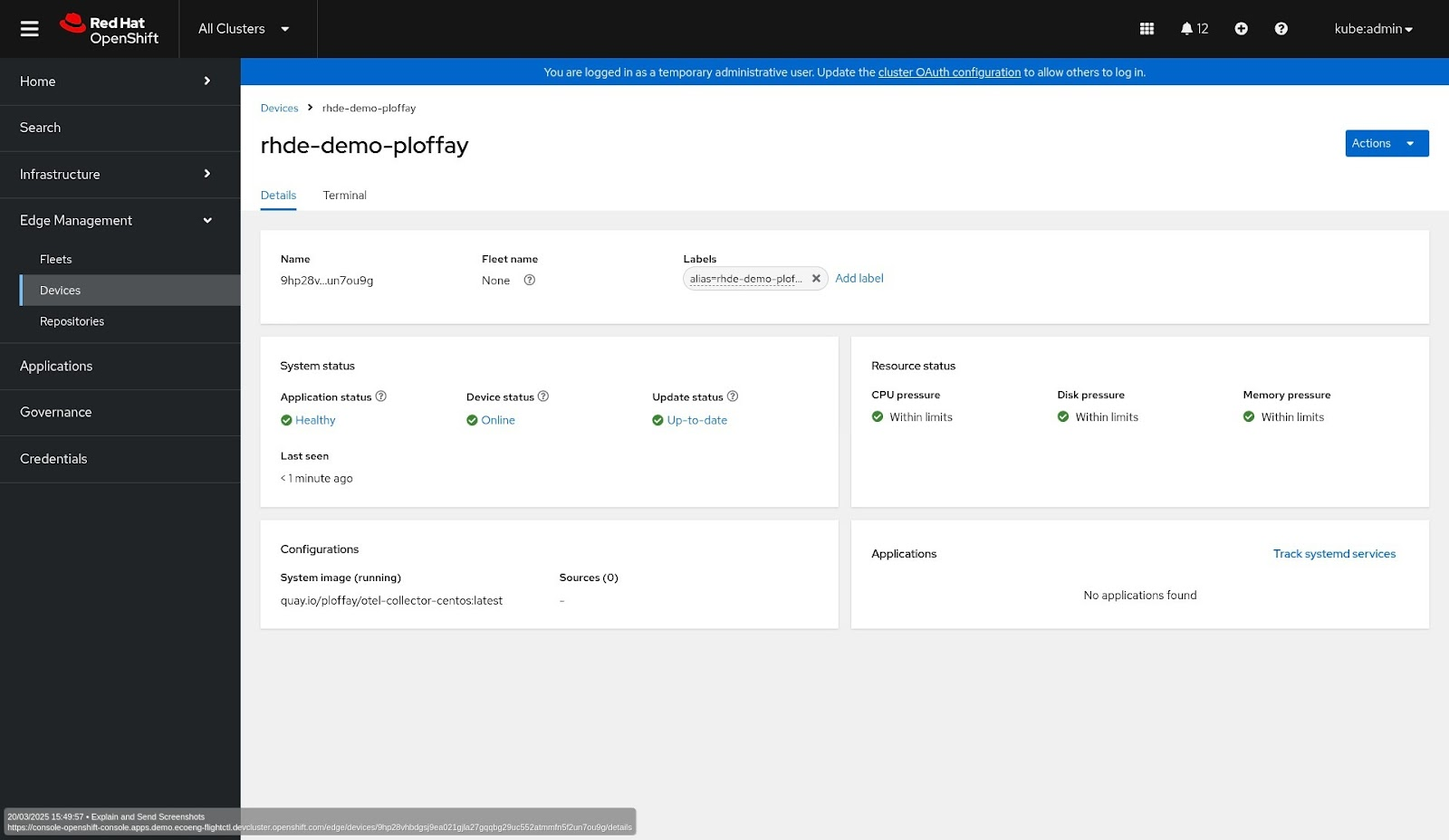 Understanding CPU utilization, memory and storage, monitoring for device failures, understanding communication breakdowns, and correlating information together for better understanding of your environment is what we bring into Red Hat Device Edge Management with OpenTelemetry integration. You can read more about edge observability use cases in this blog post: Top 5 edge computing challenges solved by Red Hat OpenShift observability