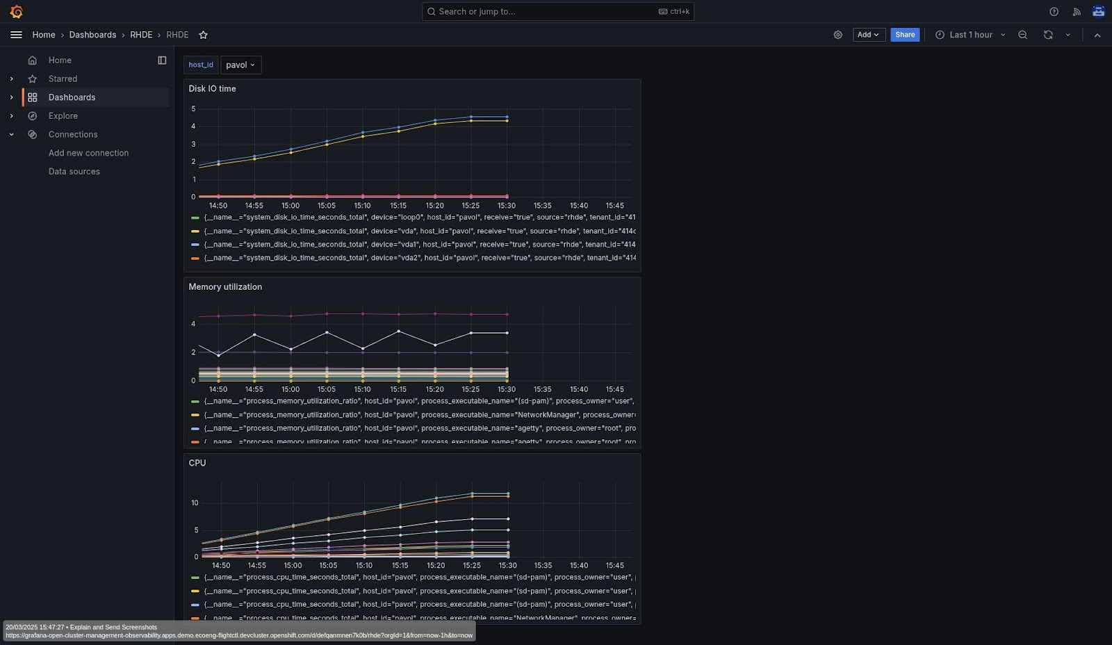 - debugThe demo repository contains more OpenShift manifests to, for instance, deploy a Cluster Observability Operator that can provision MonitoringStack with Prometheus or deploy Red Hat Advanced Cluster Management observability. There are also configuration files for a Grafana dashboard as shown in Figure 1.