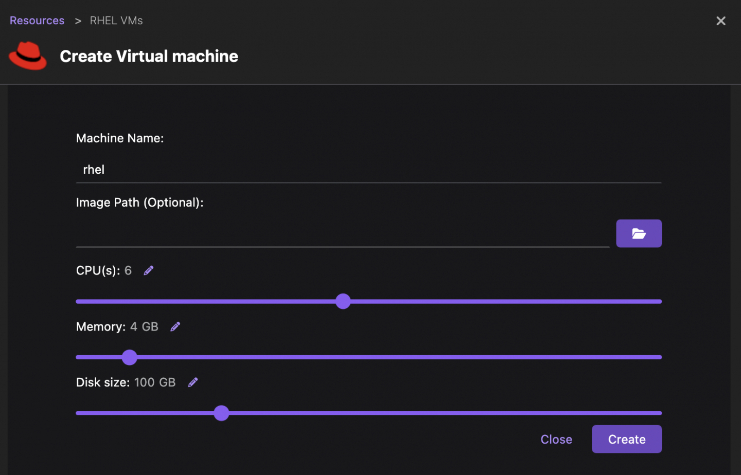 To create your first RHEL VM, navigate to the Settings page in Podman Desktop, locate the RHEL VMs section, and click Create new…. A form is presented enabling configuration of the virtual machine (Figure 3). This includes specifying the virtual machine's name, allocating resources such as CPU, memory, and disk, and optionally designating an image path. If you don't provide the image path, a pre-configured image compatible with your system will be downloaded from the Red Hat repository.