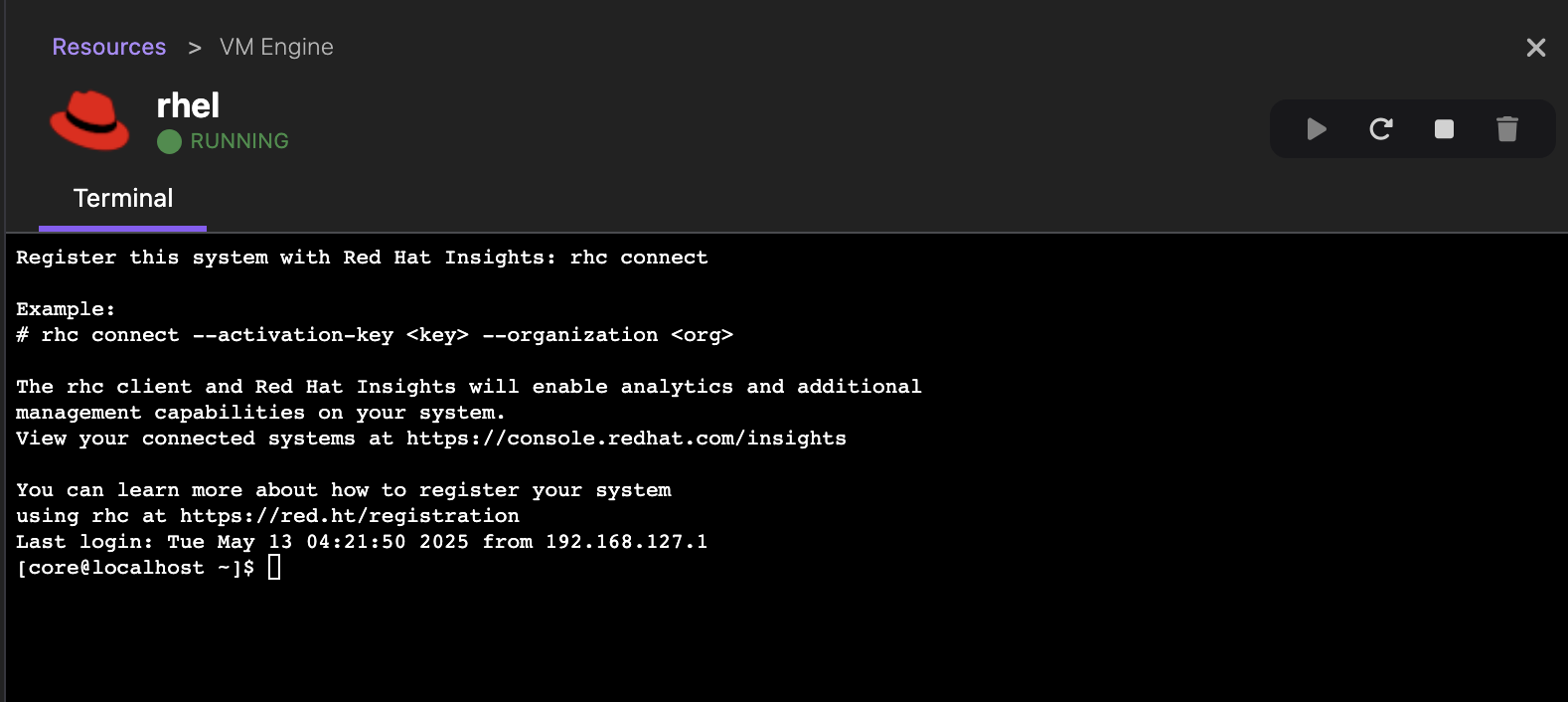 Direct access to the RHEL system is finally provided through an auto-configured SSH connection. You can obtain terminal access through the RHEL VM details page by selecting the corresponding button. See Figure 5.
