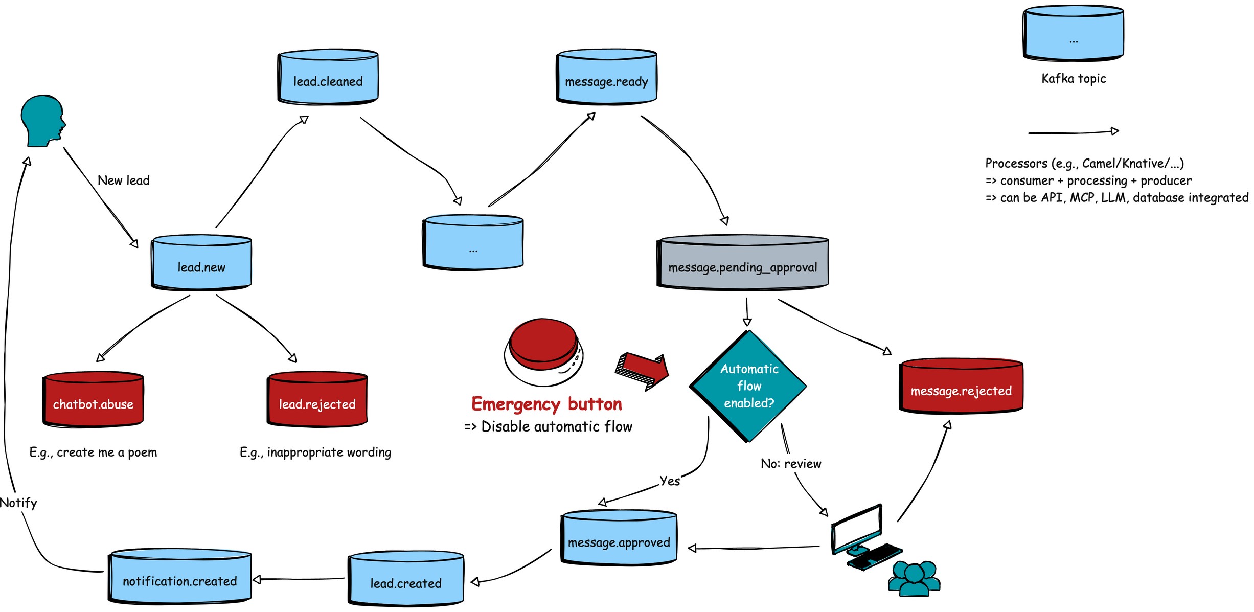 Kafka powers all of this. A decoupled service handles each step that listens to and emits events. Emergency approval ensures that no message reaches the customer without passing through brand and safety checks, providing full traceability and control.