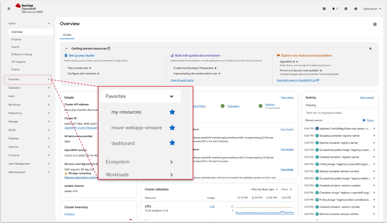The Admin and Developer perspectives have now merged into a single default view. Now you can view all tasks, from viewing topology to managing resources, from a comprehensive interface in the OpenShift console. The traditional Developer perspective can be optionally re-enabled. You can also use Favorites to bookmark and access the pages that you use the most (Figure 1).