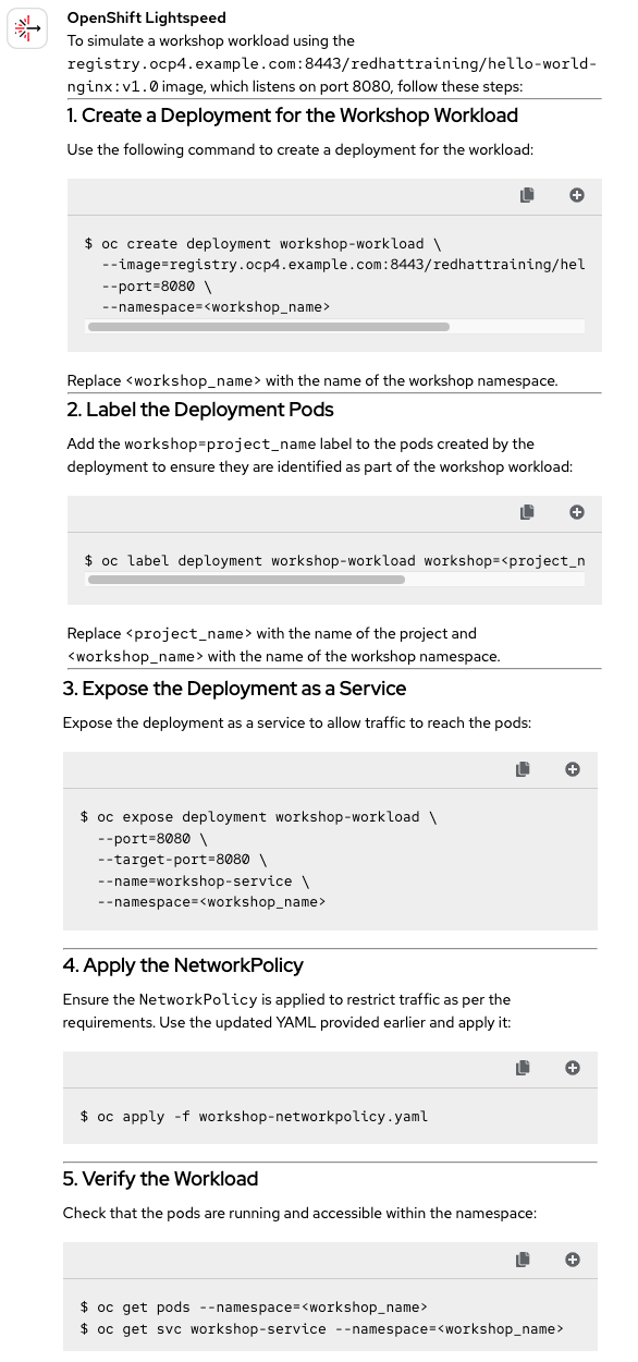 workshop: ${PROJECT_NAME} # Label to restrict traffic within the workshopThis question would require much more context for OpenShift Lightspeed to truly understand what we were trying to achieve. Additionally, the rest of the steps suggested by OpenShift Lightspeed deviate significantly from what actually needed to be done. Unfortunately, that means we have to give our first Incorrect 🔴 score. Nobody's perfect…