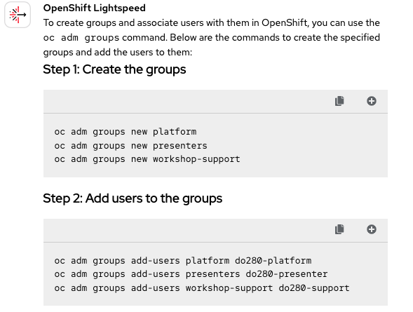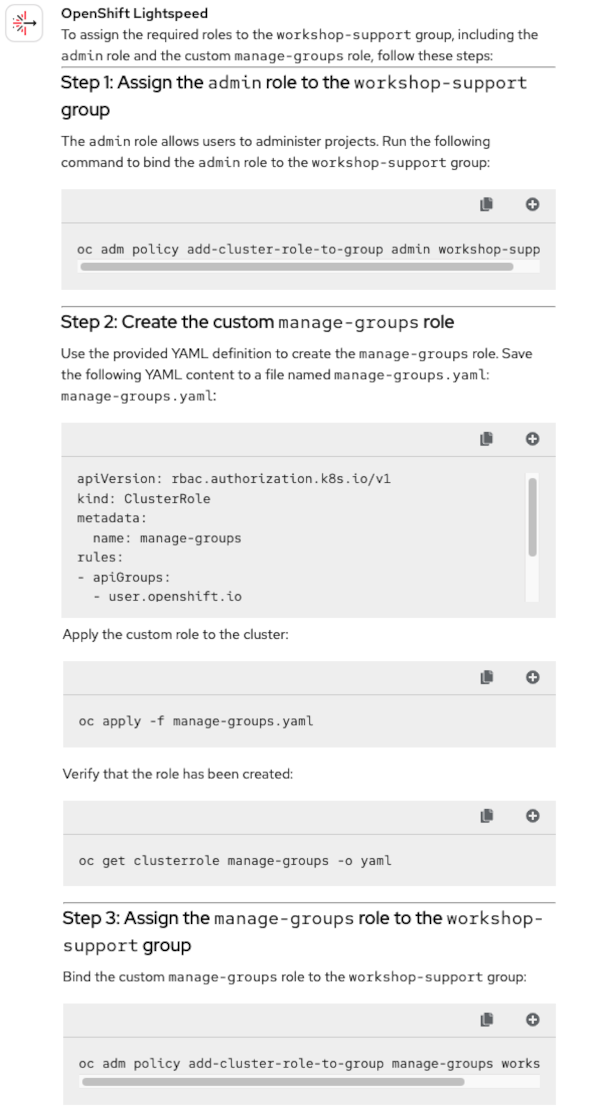 OpenShift Lightspeed suggests creating a new file called manage-groups.yaml, even though we had already attached a file with the same content but a different name. While the procedure works, it could have simply suggested applying the attached file instead of creating a new one with identical content. This seems to be because OpenShift Lightspeed does not analyze the name of the file attached to the query, only its content. Even though additional steps are being added, the process is correct and successfully answers all the questions, so we can assign it a Correct 🟢 mark.