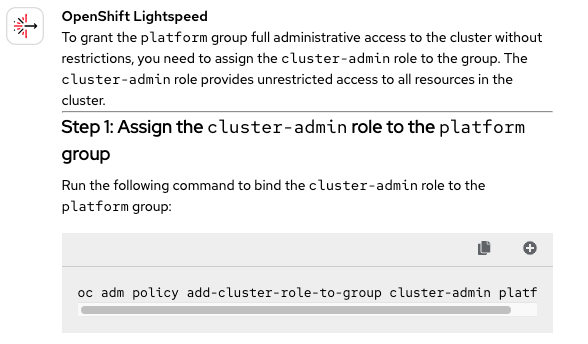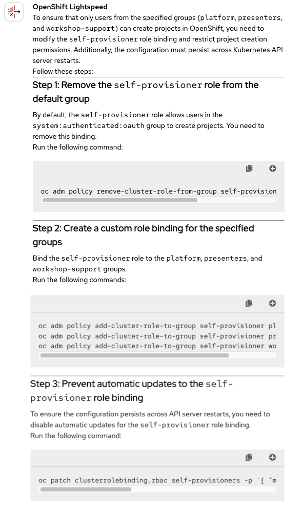In this case, let’s divide the response in three parts. First, OpenShift Lightspeed gives us a command to remove the self-provisioner cluster role for all users. This procedure is correct. However, OpenShift Lightspeed suggests removing the role from the system:authenticated group, making the command fail when executed. The group we are looking for to remove the role from should be system:authenticated:oauth. Quite similar, but not the same. However, it’s worth noting that the text generated by OpenShift Lightspeed mentions that we need to remove the binding from the system:authenticated:oauth group, even if the command states the group incorrectly.