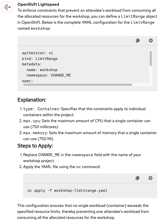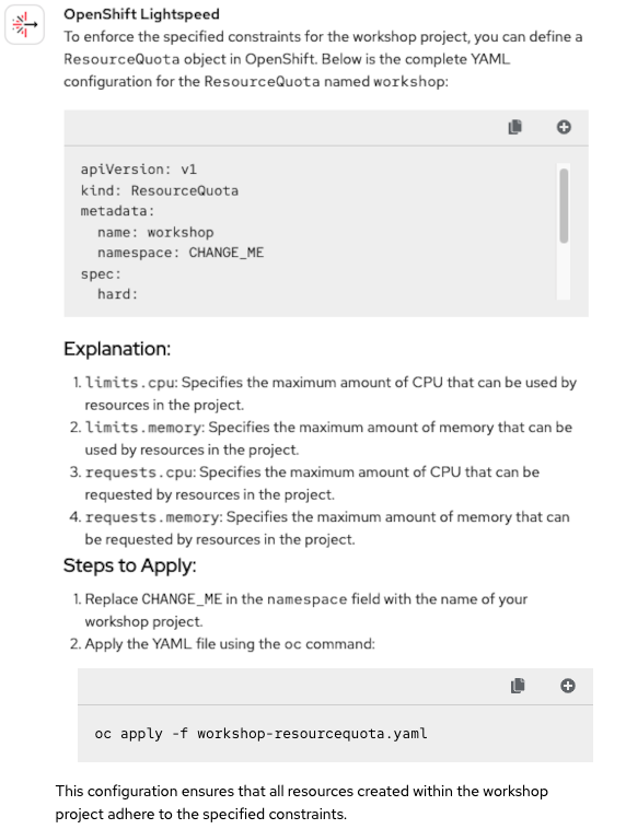 However, as we saw earlier, when applying the resource, it assumed a different file name (workshop-resourcequota.yaml) other than the one actually provided in the attachment (quota.yaml). It would be nice if OpenShift Lightspeed could also pick up the name of the attachment and include it in the response, although it's quite obvious that the file it asks you to apply is the same one you've attached.