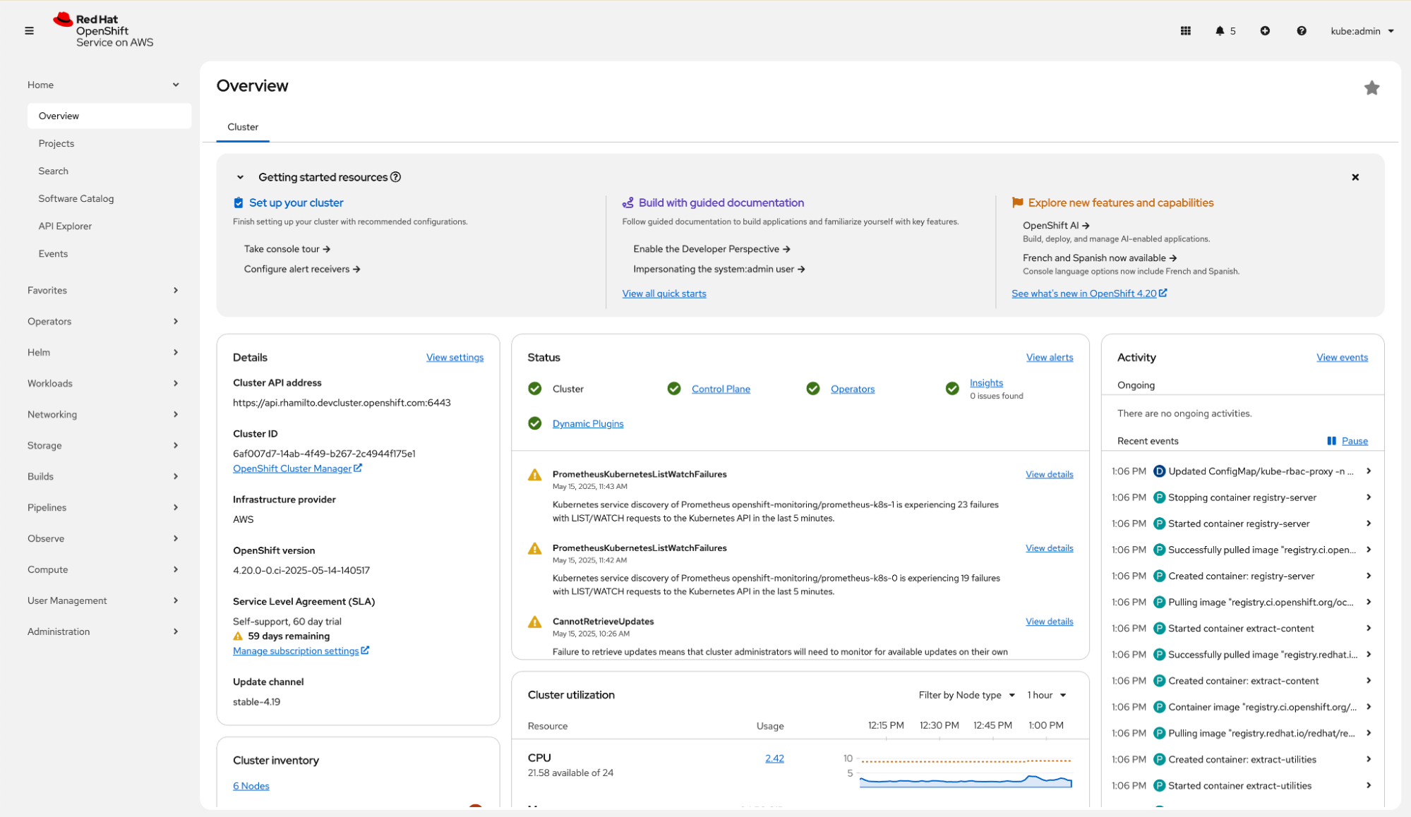 - The Administrator perspective focused on managing the infrastructure, operators, networking, and cluster-wide settings.