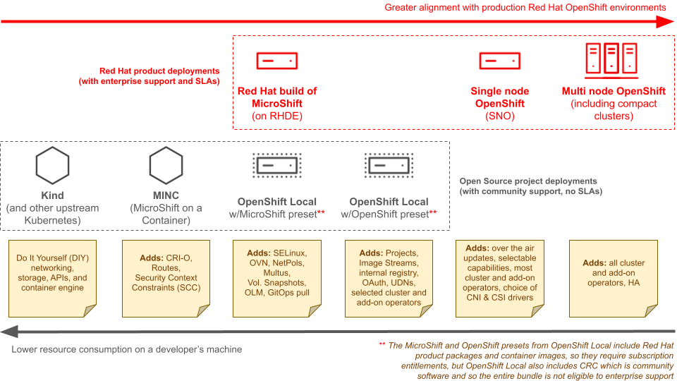 Starting from the righthand side of the image are the production-like deployments of OpenShift with enterprise support, high availability (HA), a choice of operators from Red Hat, and certified operators from third-party vendors.