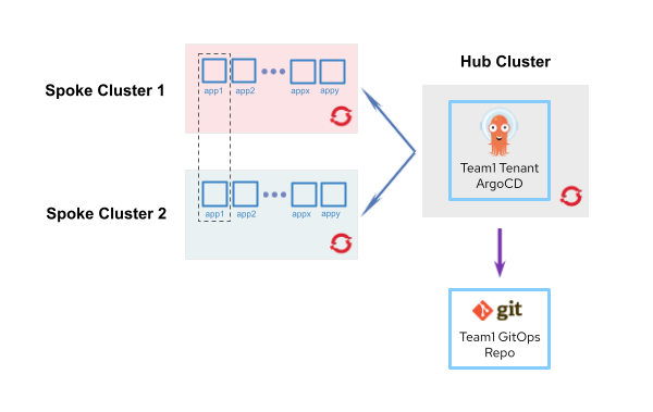 The diagram in Figure 2 illustrates how a tenant called team1 deploys its applications to OpenShift. As explained in the previous sections, a dedicated Argo CD instance for the tenant runs on the hub cluster, and it handles application deployment.