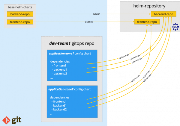 For the rest of this article, we will describe the backend approach. Let’s look at what a GitOps configuration repository consisting of Helm multi-component application deployments might look like.