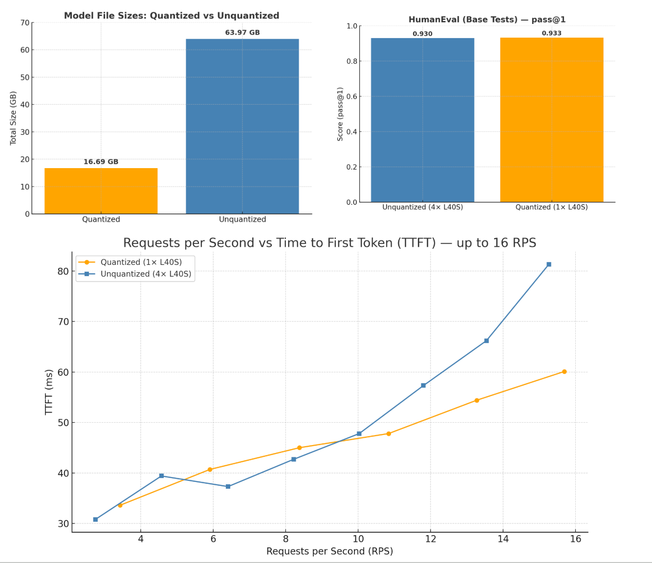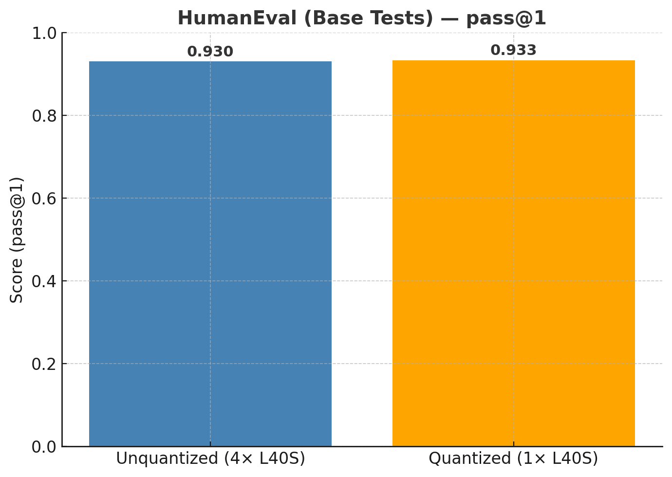 Running the same evaluations on the quantized model produced a 93.3% pass@1 on HumanEval, a slight increase on accuracy compared to the unquantized model.