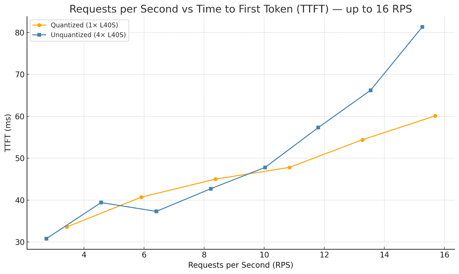 Time to First Token (TTFT) is also consistently reduced, with the quantized model staying well below the multi-GPU unquantized setup. (See Figure 6.)