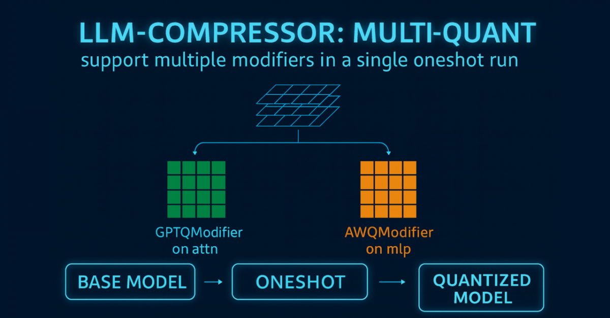 LLM Compressor now supports the use of multiple modifiers within a single oneshot compression run. This capability allows practitioners to apply different modifiers to specific submodules—such as combining AWQ and GPTQ for W4A16 quantization—while only having to apply a dataset once through a single calibration run. This feature enables enhanced support for non-uniform quantization, giving users the flexibility to account for varying sensitivity across layers and more options for post-training quantization (PTQ) experimentation.