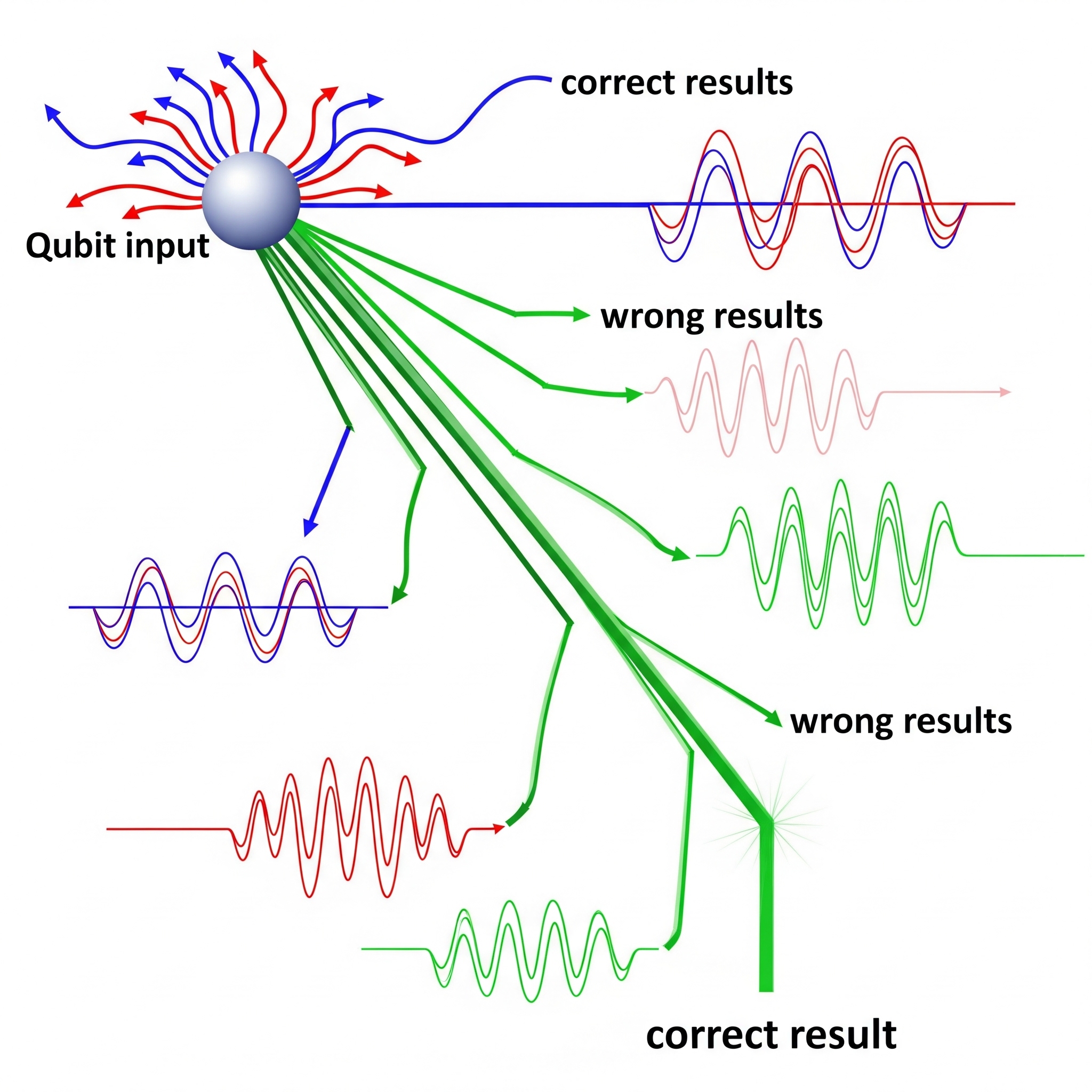 Interference, illustrated in Figures 5 and 6, is the mechanism that allows quantum algorithms to strengthen the right answers and reduce the impact of the wrong ones. This is visualized by the waves in Figure 6, where some combine to create larger waves (constructive interference) and others cancel each other out (destructive interference).