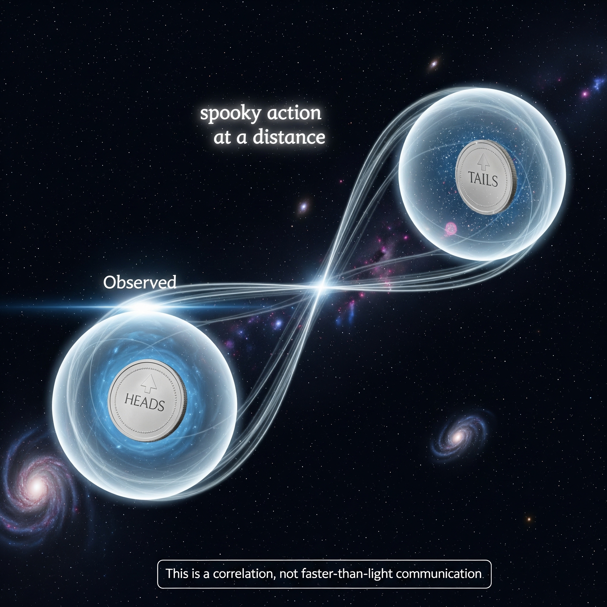 Now introduce entanglement: when two qubits become deeply correlated in a way that measuring one tells you something about the other. For example, if you measure one, and it collapses to "heads," the other is guaranteed to be "tails." But—and this is crucial—this correlation doesn't transmit information. It's instantaneous but doesn't allow faster-than-light communication, so when you measure one particle, you know the state of the other particle instantly, but you don't have control over that. Einstein famously called it "spooky action at a distance," and he wasn't wrong about the weirdness.