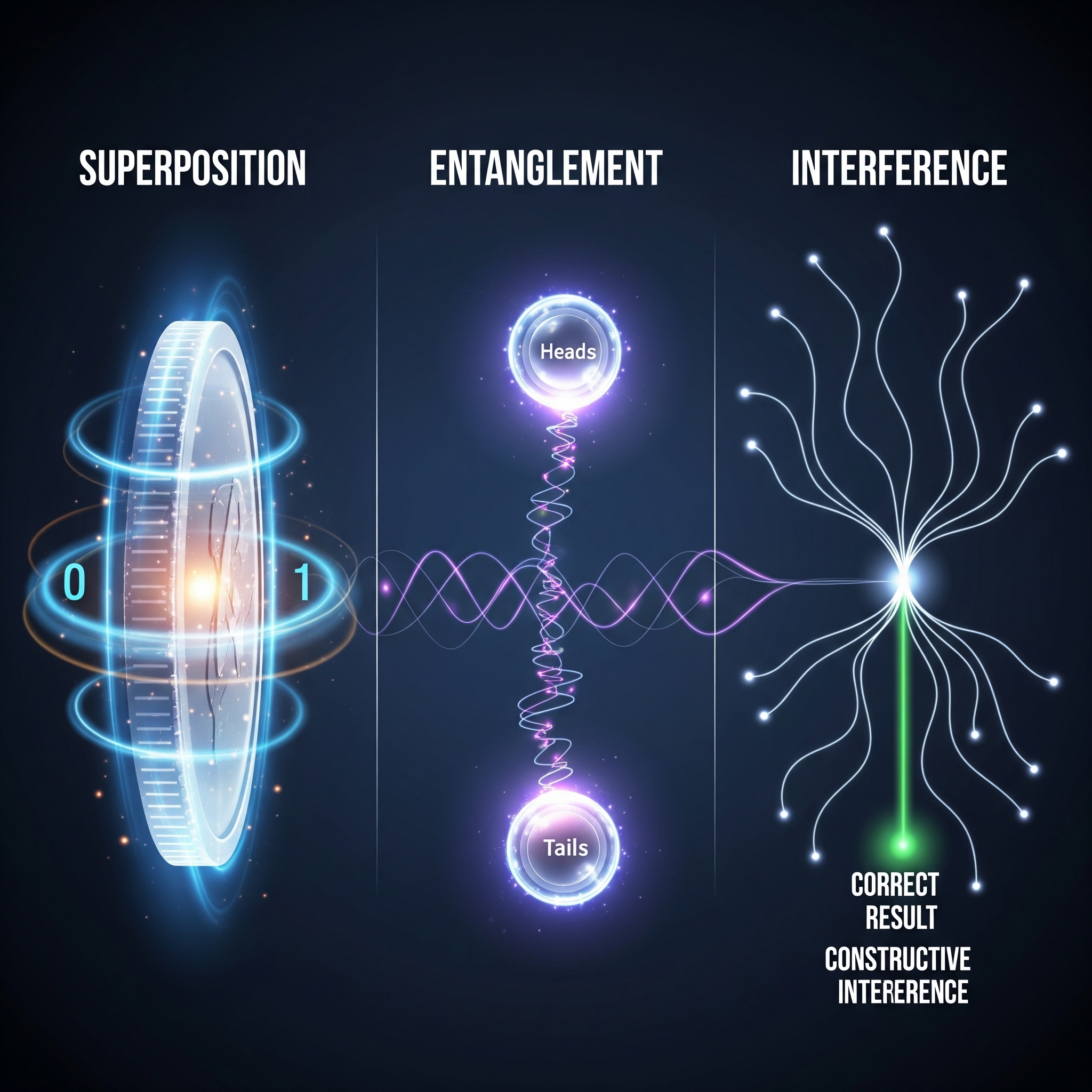 Together, superposition, entanglement, and interference form the foundation of quantum computing and are central to quantum mechanics.