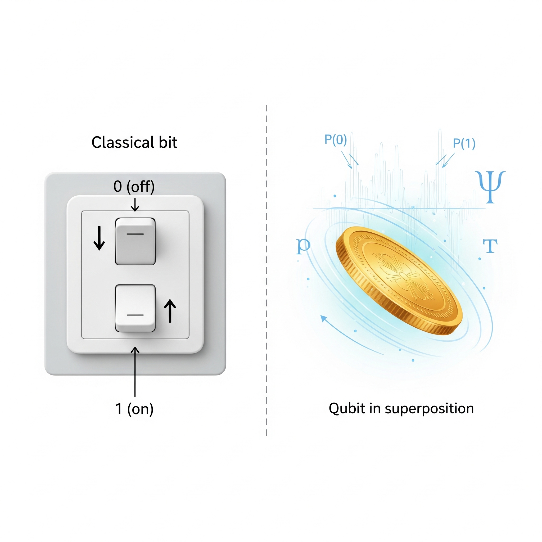 Quantum computers don't use bits; they use qubits, short for "quantum bits." Unlike classical bits, which are always either 0 or 1, a qubit exists in a quantum state that can include a combination of 0 and 1, what we call superposition.