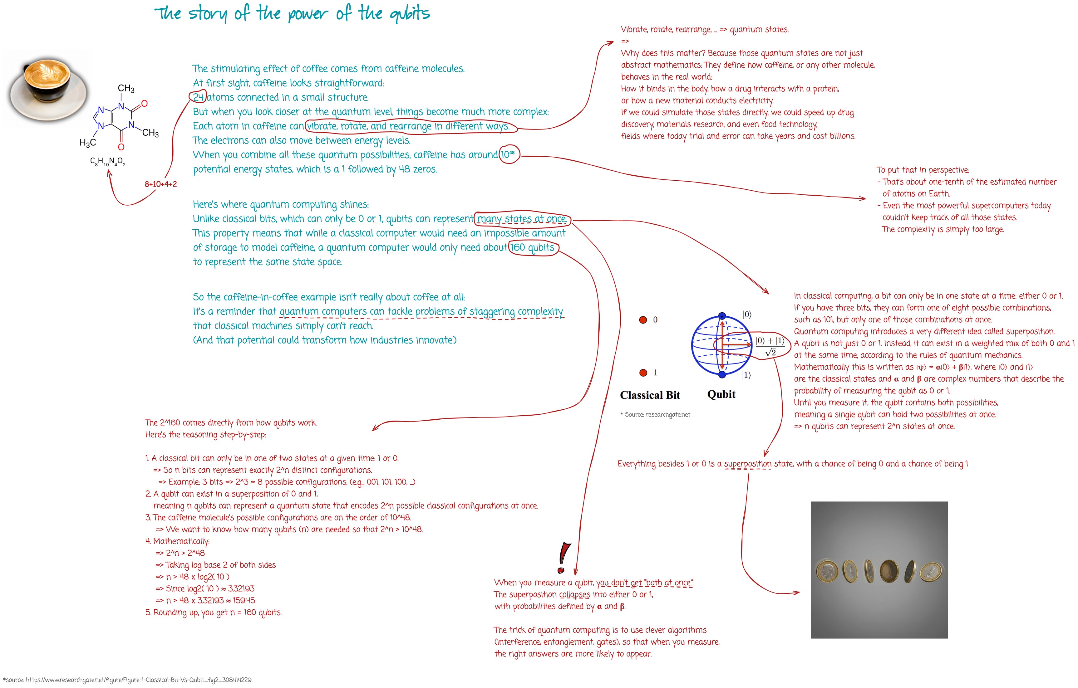 Here's where quantum computing shines. Unlike classical bits, which can only be 0 or 1, qubits can represent many states at once. This property means that while a classical computer would need an impossible amount of storage to model caffeine, a quantum computer would only need about 160 qubits to represent the same state space.