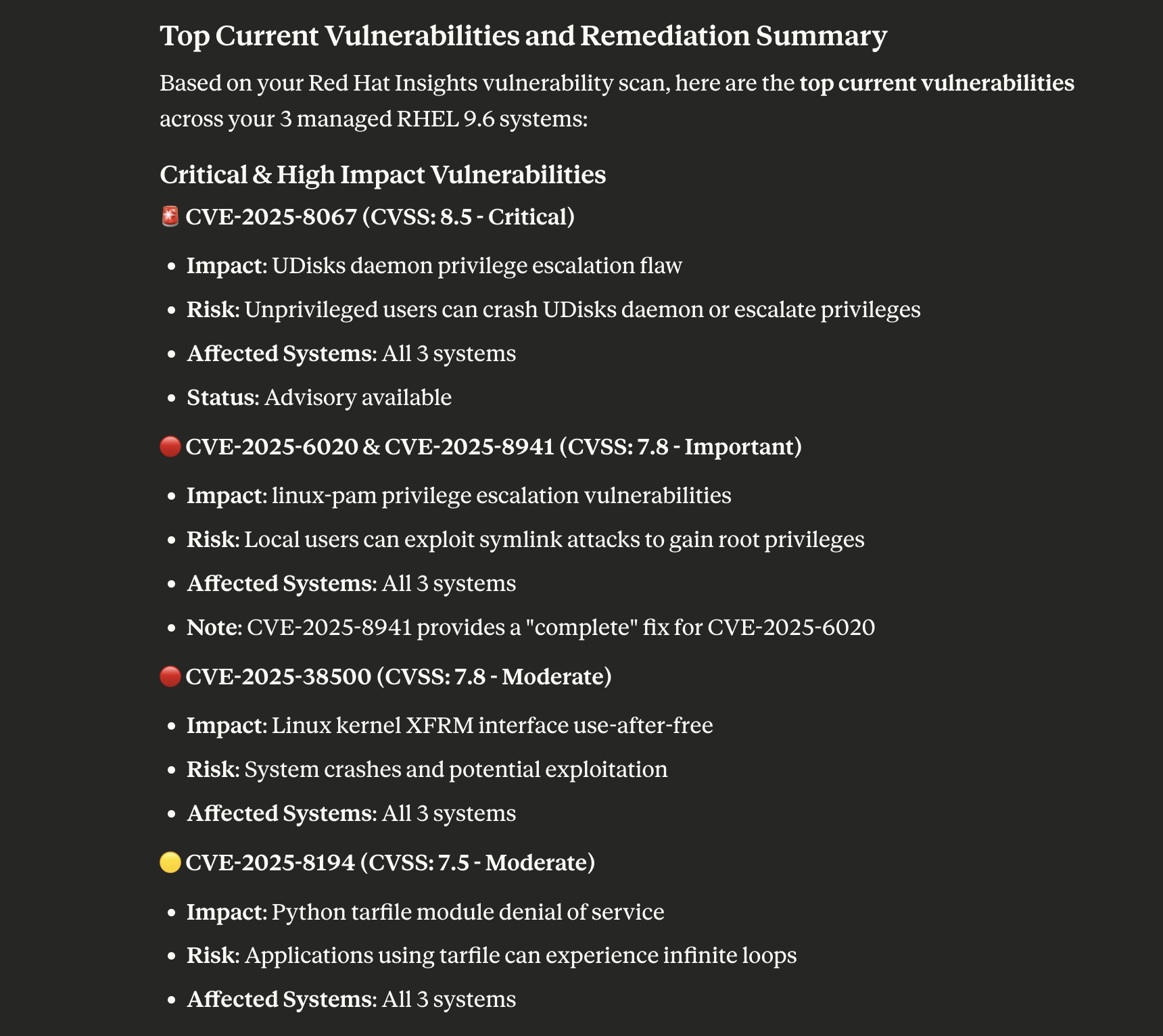 To receive data from Red Hat Insights about vulnerability and actionable remediations, use a prompt like: