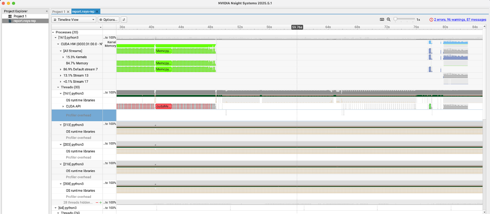 directory to your local machine and open it with the NVIDIA Nsight Systems GUI. As Figure 4 shows, this tool provides a detailed timeline of CPU and GPU activities, including CUDA kernel launches, memory transfers, and API calls, allowing for in-depth performance analysis.