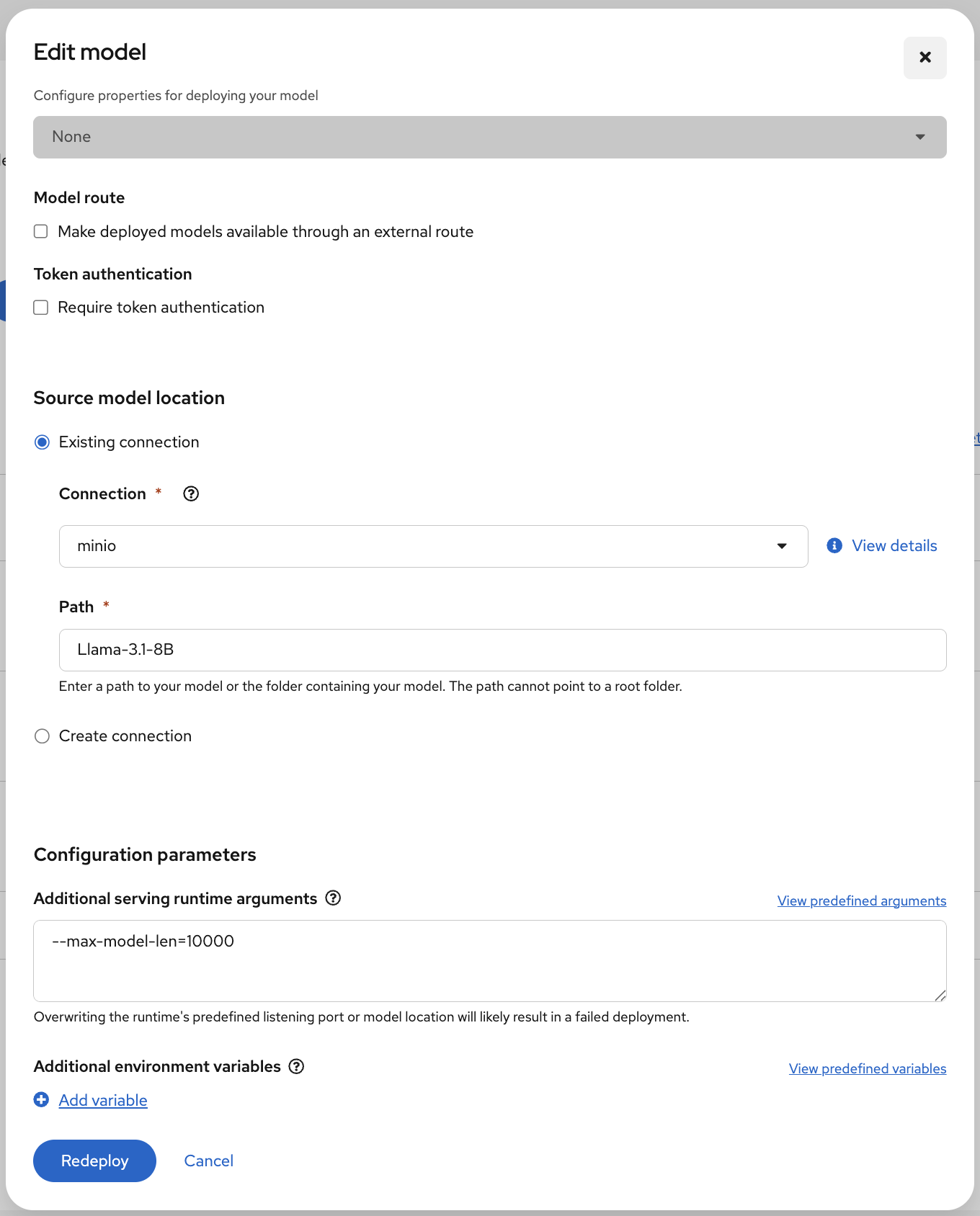 A possible obstacle is that if the MinIO Route is deployed with the default self-signed certificate, KServe (the underlying model serving platform) will fail to pull the model because it cannot verify the SSL certificate. The KServe InferenceService does not expose a simple verify_ssl: false option.