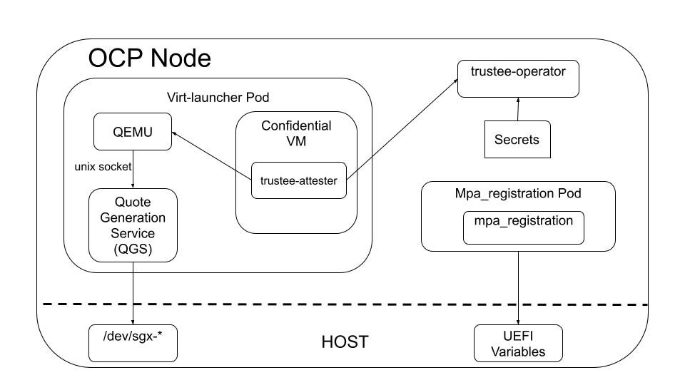 This is the second article in a series that demonstrates how to enable confidential computing for Red Hat OpenShift Virtualization using various confidential computing technologies. Our previous article covered AMD’s SEV-SNP. Here, we will explain how to configure OpenShift Virtualization to launch these confidential VMs using Intel Trust Domain Extensions (TDX) technology. We'll also demonstrate how to attest to the security of these VMs using a tool called Trustee. Specifically, we'll use trustee-attester when the VM boots up to securely decrypt the VM's disk, ensuring that sensitive data is only accessible when the VM is proven trustworthy.