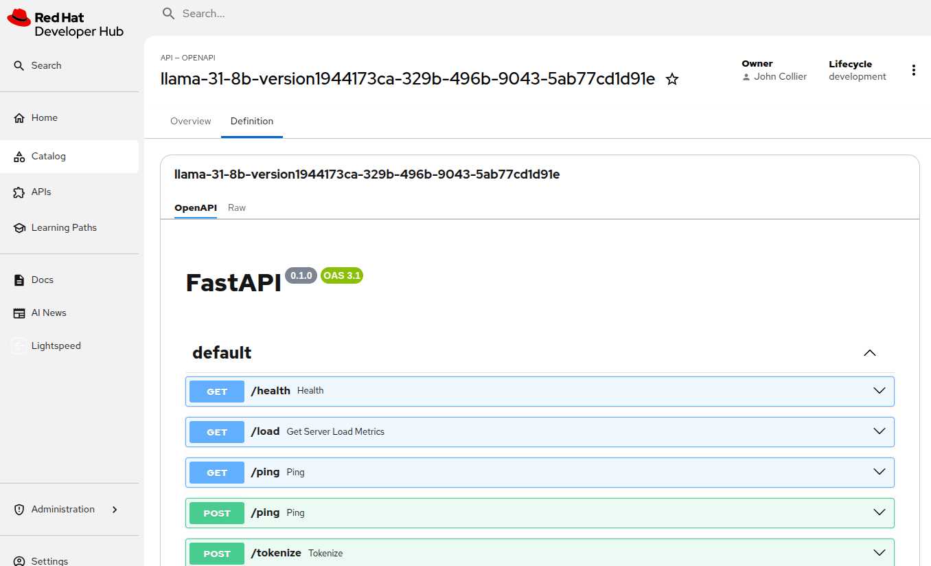 Accessing REST API documentation or the model cardsh within Developer Hub adheres to the core Backstage tenet: providing a central location for information for development teams.