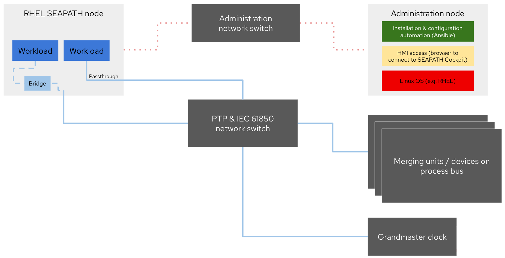 Also on the network topology (see Figure 3), a normal RHEL installation does not differ from a setup suggested by SEAPATH. The RHEL node would be accessed from an administration node (which could also be an operator workstation) to drive automated setup and configuration, and to access system dashboards running in RHEL’s Cockpit using a web browser. The vPAC workload (whether running in a VM or a container) can be connected to the station and process bus networks where the PTP clock and sampled value (SV) publishers (for example, merging units or in-lab environment simulators) reside. This can be over a dedicated physical network interface card (NIC) on the host, passed directly to the workload for exclusive use, or it can leverage virtual networks provided by the OS, KVM, and OVS. Also, SR-IOV NICs are a supported option.